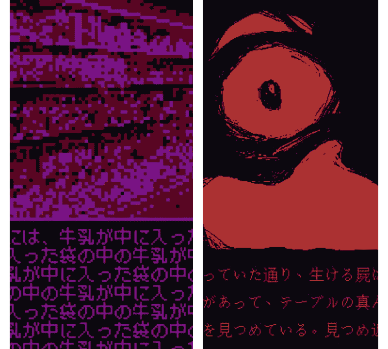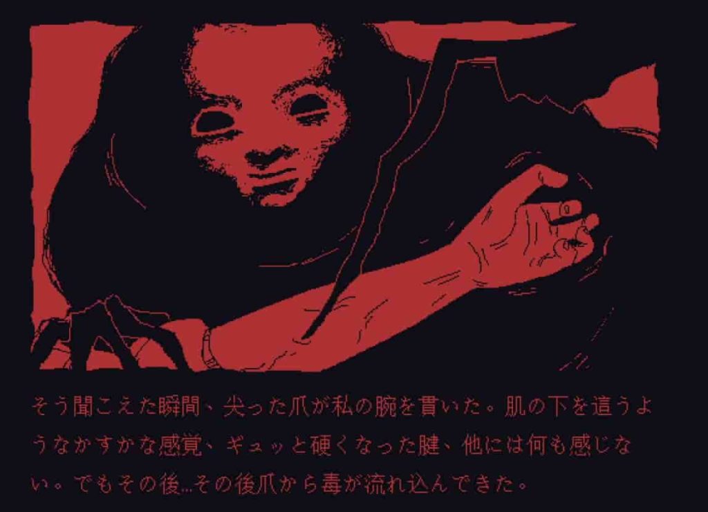 ©Nikita Kryukovですが、少女には精神的な疾患と過去のトラウマがあり、その影響によって外の世界の外観やキャラクターの他、全てが赤紫色の崩壊したドット絵のように歪んで見えているため、これだけでもプレイヤーにただならぬ恐怖心を与えることになります。